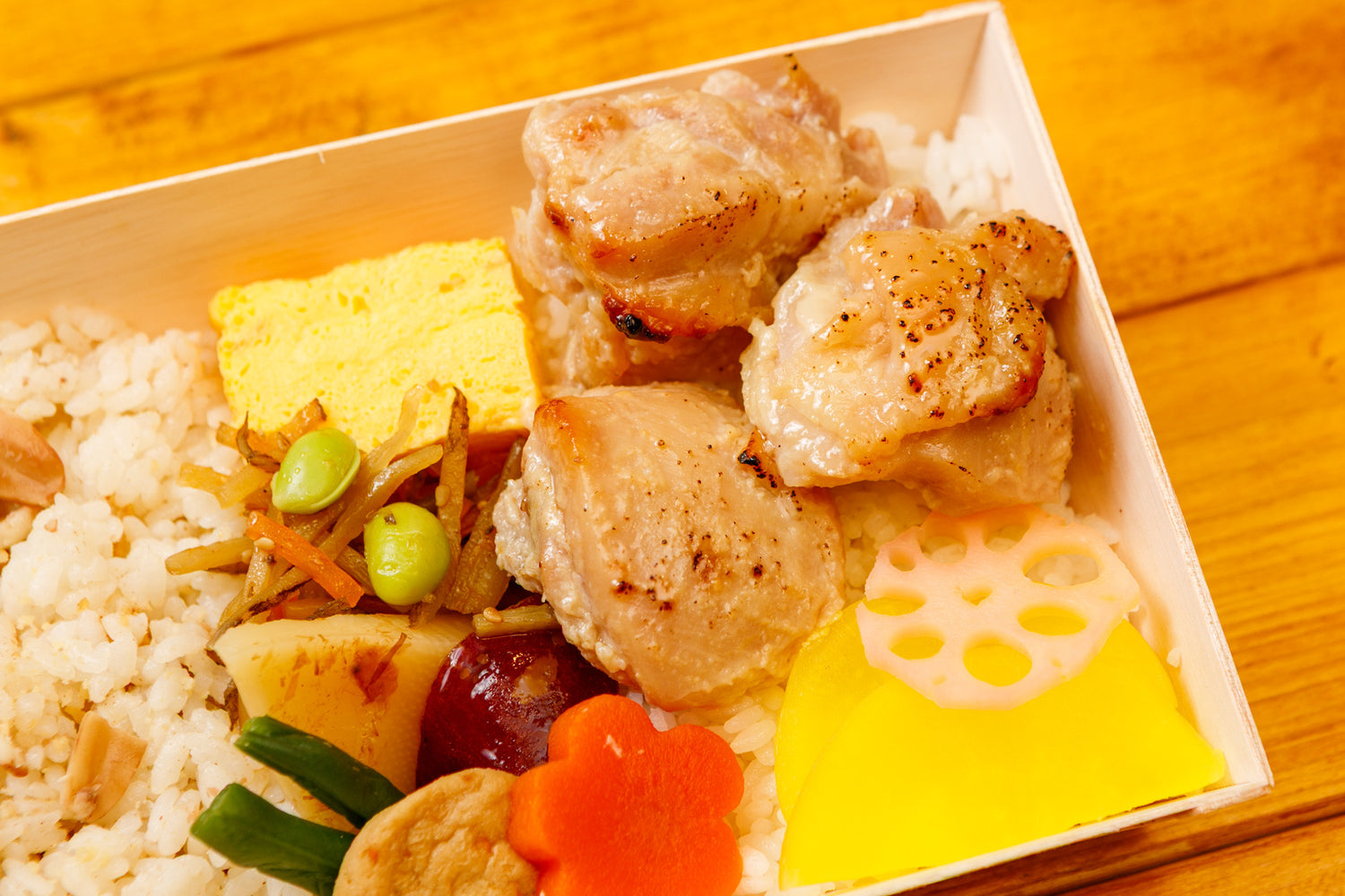 西京味噌に漬け込んだ鶏ももや魚は、甘みと香りのバランスを見極め、冷めても硬くならない火入れで仕上げました。